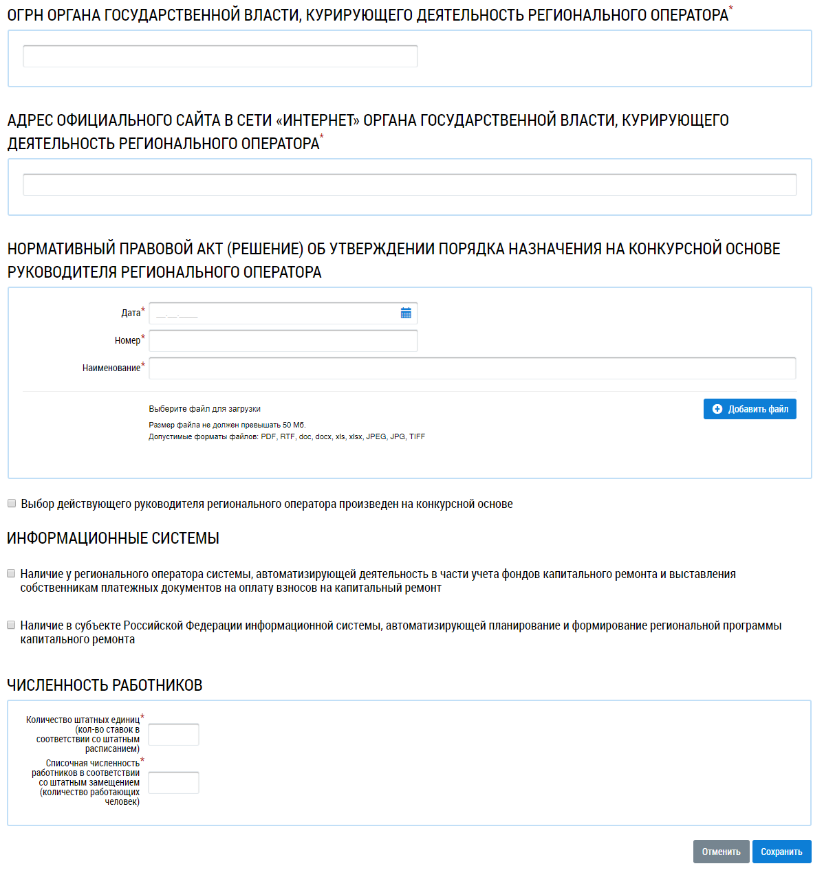 В блоках Нормативный правовой акт органа государственной власти субъекта Российской Федерации о создании регионального оператора капитального ремонта и Нормативный правовой акт (решение) об утверждении порядка назначения на конкурсной основе руководителя регионального оператора введите значения в поля, начиная с поля Дата. При необходимости прикрепите документ, нажав на кнопку Добавить файл. В случае, если выбор действующего руководителя регионального оператора произведен на конкурсной основе установите переключатель в соответствующем поле.