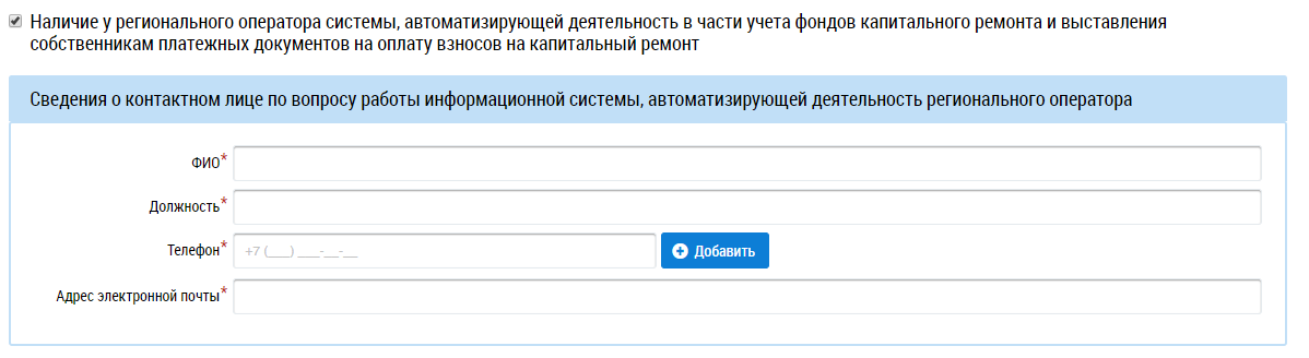 При наличии у регионального оператора системы, автоматизирующей деятельность в части учета фондов капитального ремонта и выставления собственникам платежных документов на оплату взносов на капитальный ремонт установите флажок в соответствующее поле. Отображается дополнительный блок Сведения о контактном лице по вопросу работы информационной системы, автоматизирующей деятельность регионального оператора.