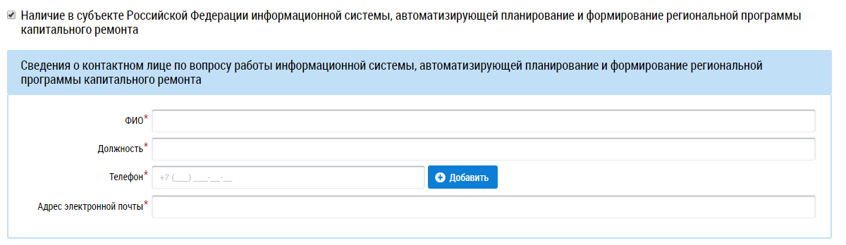 При наличии в субъекте Российской Федерации информации информационной системы, автоматизирующей планирование и формирование региональной программы капитального ремонта, установите галочку в соответствующем поле. Отображается дополнительный блок Сведения о контактном лице по вопросу работы информационной системы, автоматизирующей планирование и формирование региональной программы капитального ремонта.