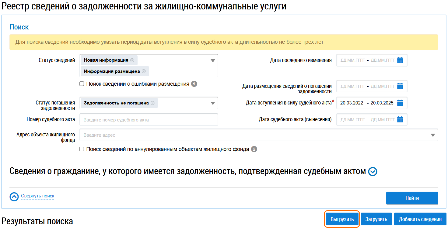 Для того, чтобы выгрузить сведения о задолженности за жилищно-коммунальные услуги перейдите на страницу Реестр сведений о задолженности за жилищно-коммунальные услуги, сформируйте поисковый запрос и в результатах поиска нажмите кнопку Выгрузить.