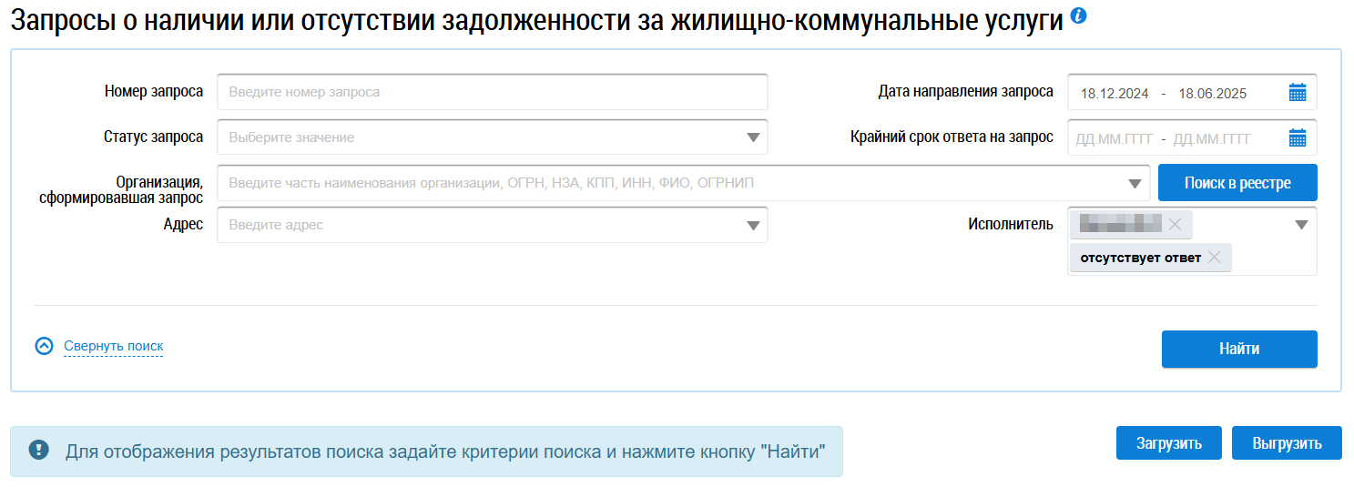 Данный раздел доступен после предоставления представителю организации права доступа «Работа с формированием ответов на запросы о наличии или отсутствии задолженности за ЖКУ». Для получения необходимых прав обратитесь к Администратору организации.