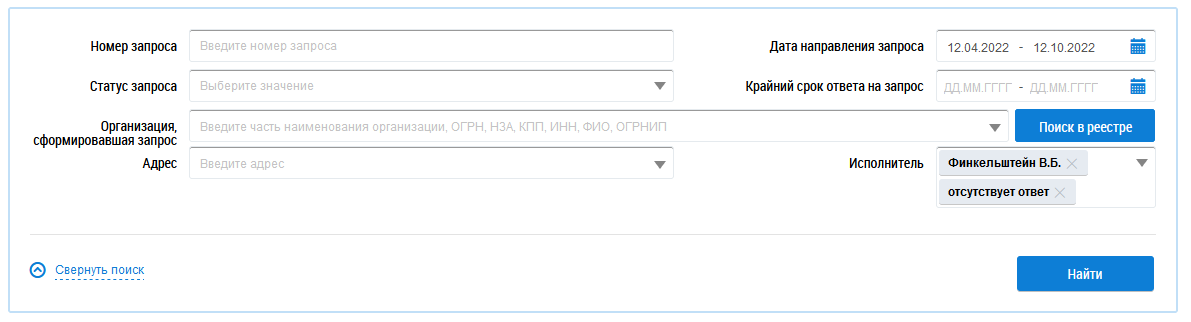 Для поиска по реестру запросов заполните одно или несколько полей блока поиска. Чем точнее будет составлен поисковый запрос, тем уже будет выборка результатов.