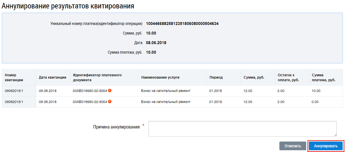Укажите причину аннулирования результатов квитирования и нажмите на кнопку Аннулировать.