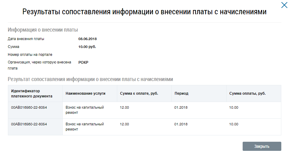 Отображается страница Результаты сопоставления информации о внесении платы с начислениями. Для возврата на страницу результатов квитирования нажмите на кнопку Закрыть.