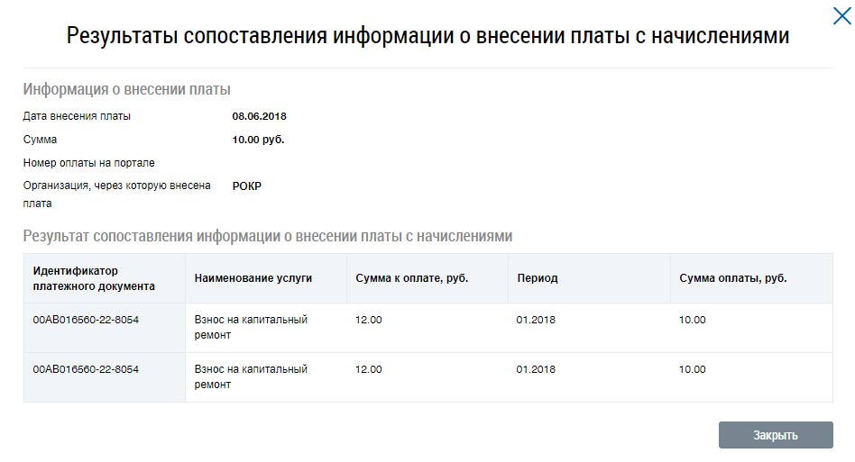 Отображается окно Результаты сопоставления информации о внесении платы с начислениями. Для возврата на страницу результатов квитирования нажмите на кнопку Закрыть.