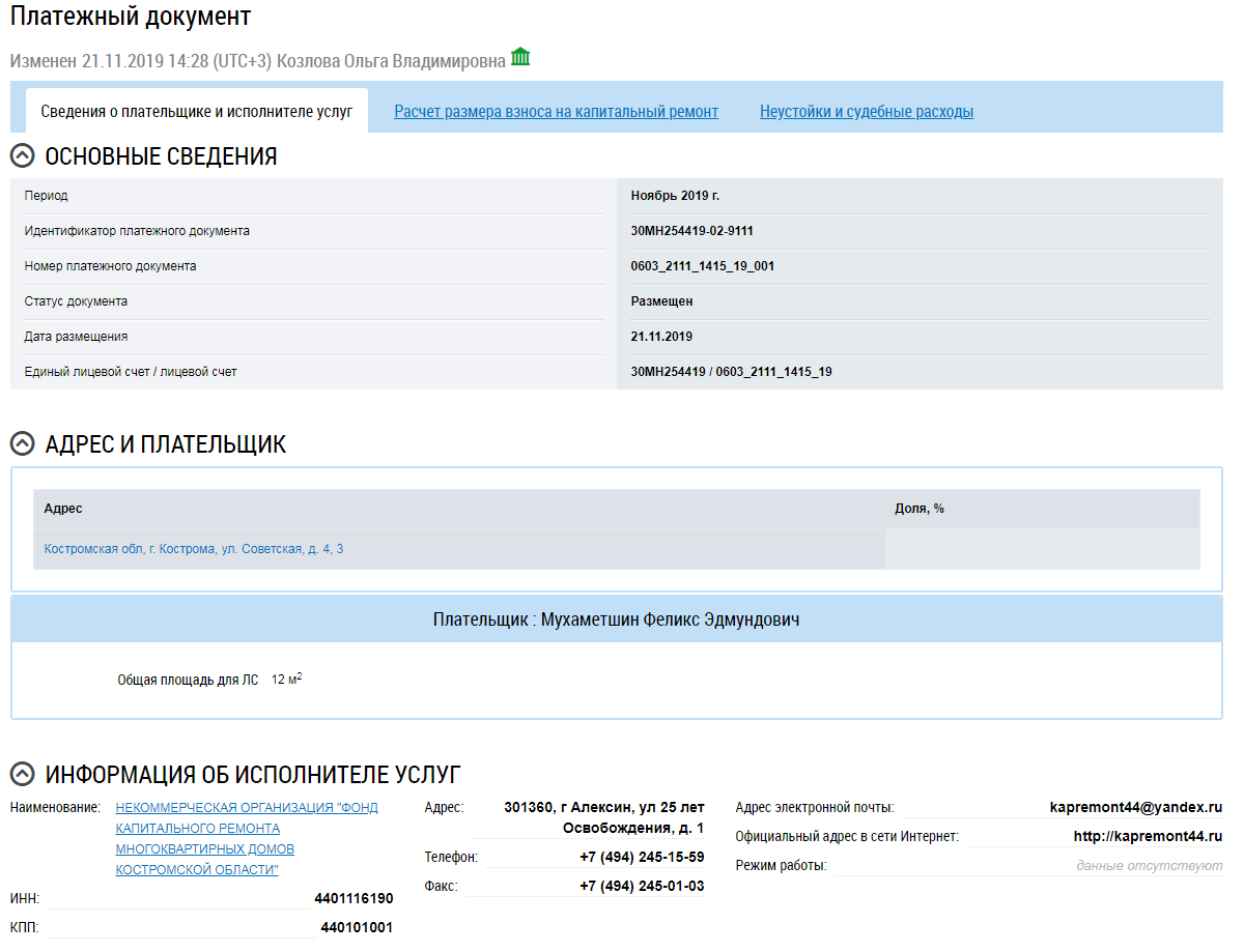Страница содержит следующие блоки со сведениями: Основные сведения, Адрес и плательщик, Информация об исполнителе услуг и Информация для внесения платы получателю платежа (получателям платежа).