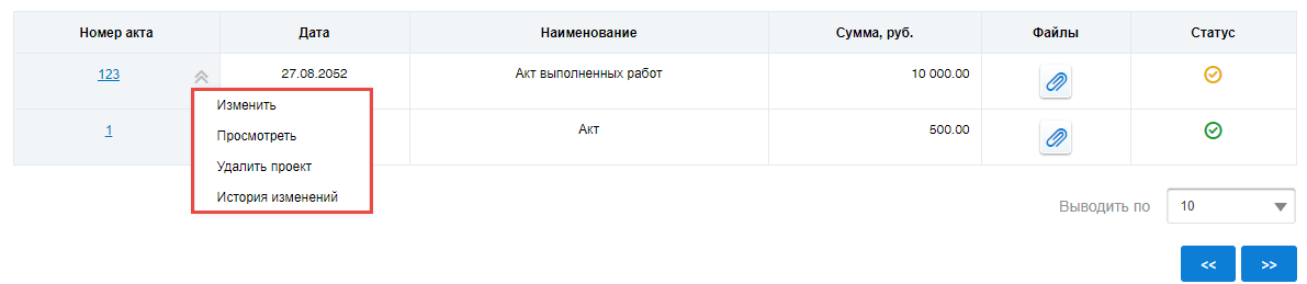 Для редактирования актов выполненных работ выберите пункт контекстного меню Изменить акта в статусе Не размещено (проект).