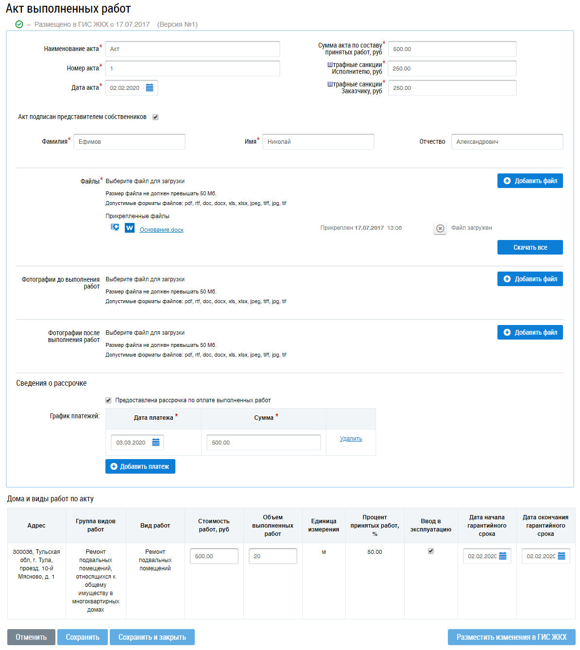 Для внесения изменения в размещенный акт на выполнение работ выберите пункт контекстного меню Внести изменения (Пункты контекстного меню акта).