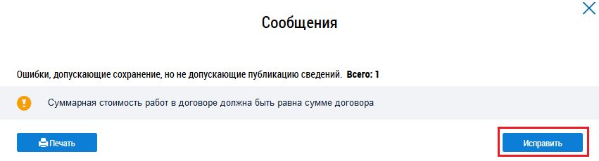 Для размещения договора необходимо исправить данную ошибку, нажав на кнопку Исправить.