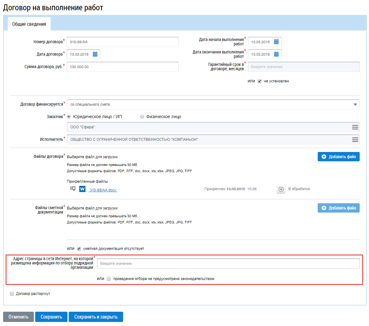 Для добавления адреса страницы в сети Интернет, на которой размещена информация по отбору подрядной организации, заполните соответствующее поле.