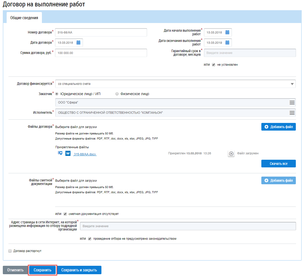 Введите значения в поля Номер договора, Дата договора, Сумма договора, руб., Дата начала выполнения работ, Дата окончания выполнения работ и Гарантийный срок в договоре, месяцев. При отсутствии гарантийного срока установите флажок в поле не установлен.