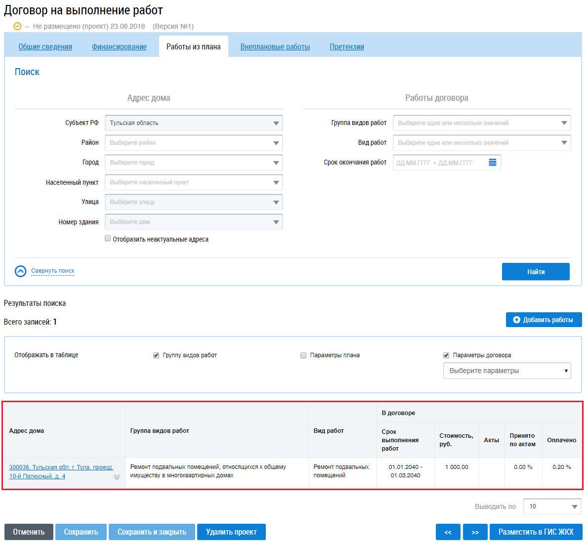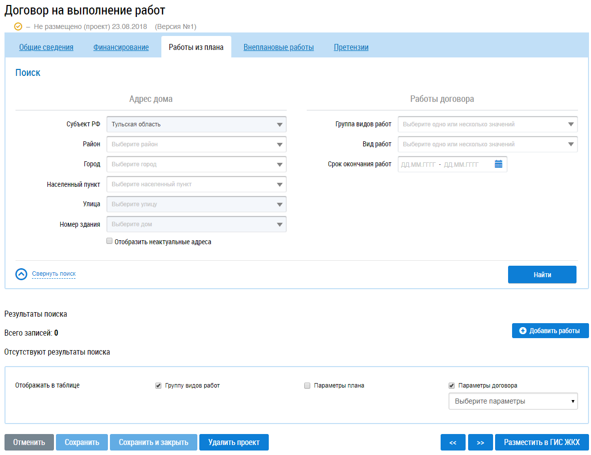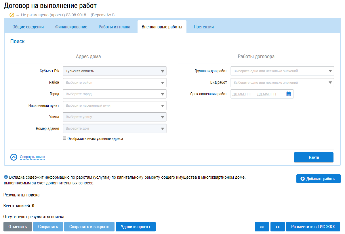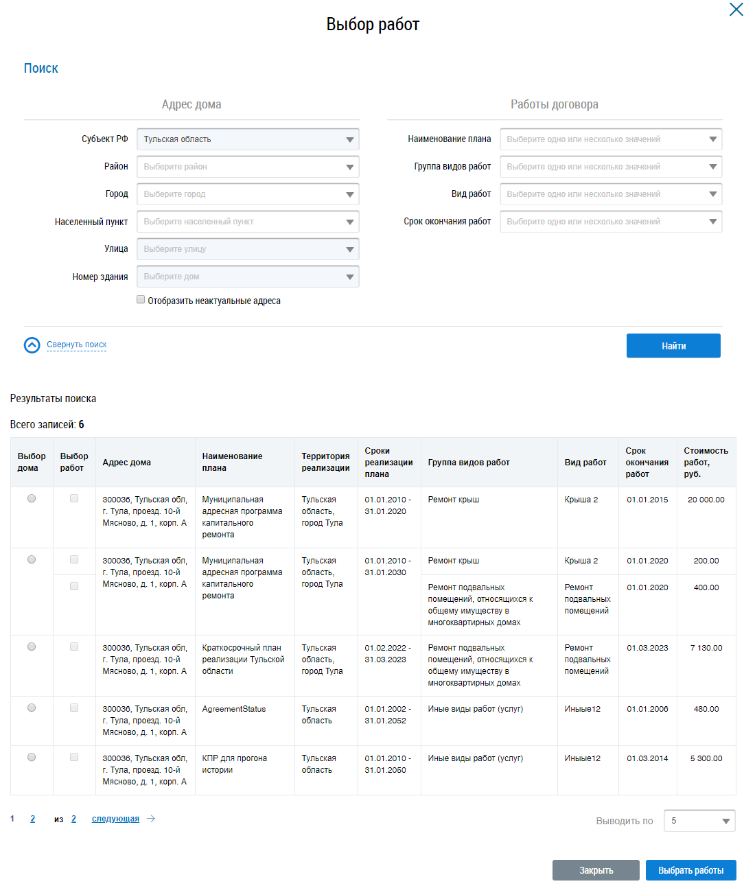 Для поиска информации выберите значения из выпадающего списка в блоках Адрес дома и Работы договора и нажмите на кнопку Найти.