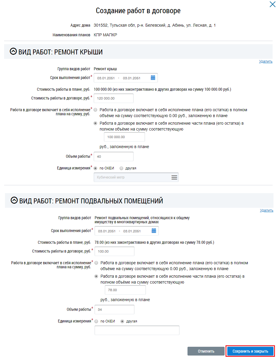 Внесите необходимые изменения и нажмите на кнопку Сохранить и закрыть (Окно «Создание внеплановых работ в договоре»).