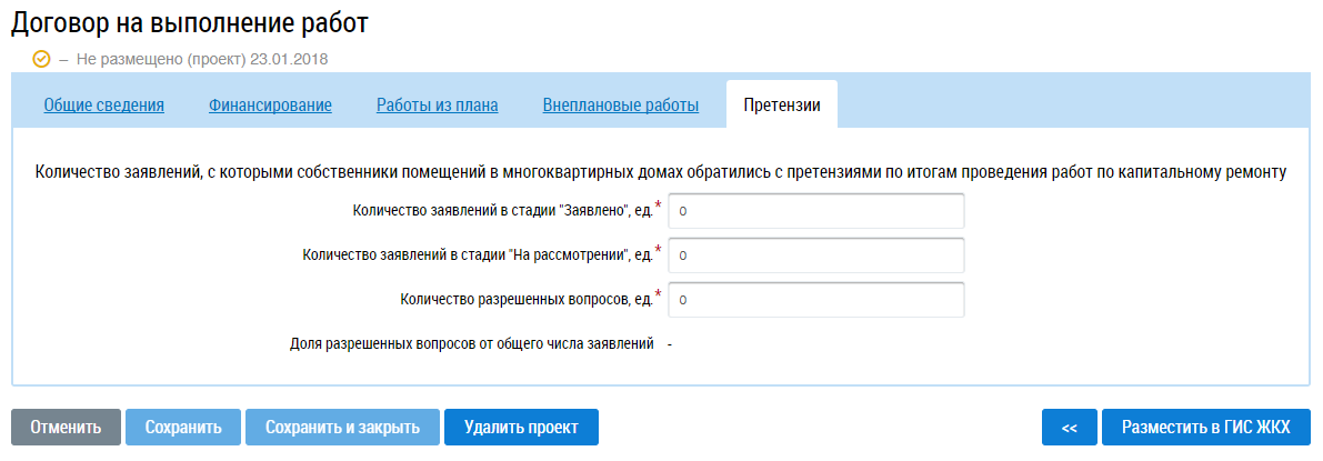 Заполните обязательные поля в блоке Количество заявлений, с которыми собственники помещений в многоквартирных домах обратились с претензиями по итогам проведения работ по капитальному ремонту и нажмите на кнопку Сохранить или Сохранить и закрыть.