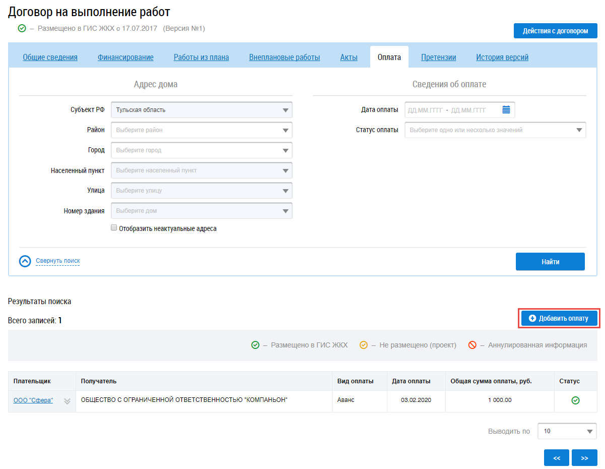 Для добавления факта оплаты нажмите на кнопку Добавить оплату.