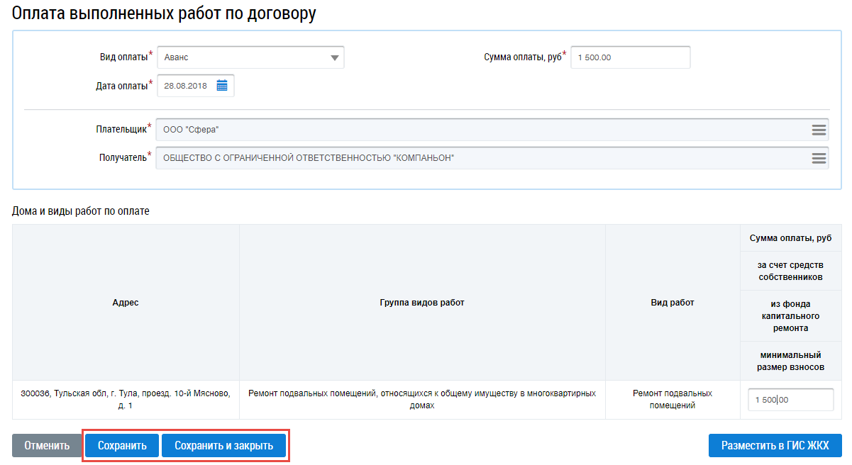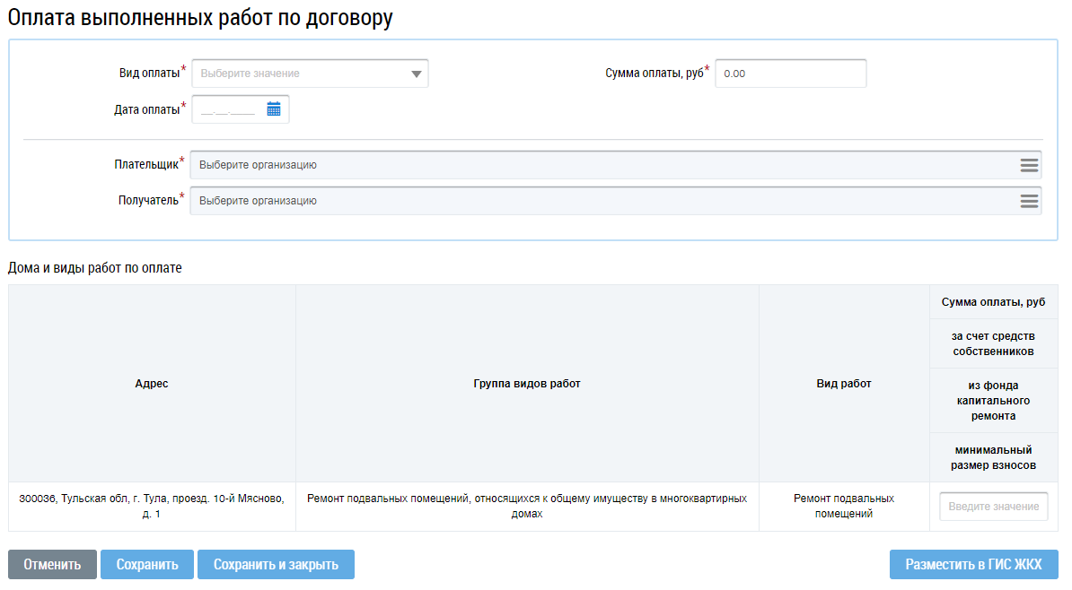 Введите значение в поле Сумма оплаты, руб. в блоке Дома и виды работ по оплате и нажмите на кнопку Сохранить или Сохранить и закрыть.