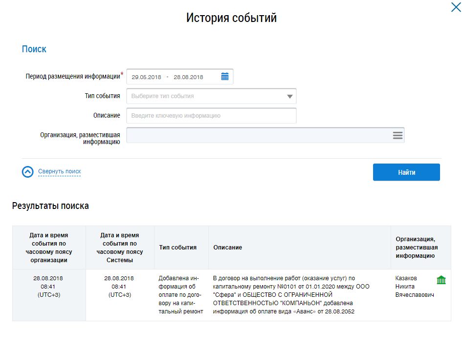 Для просмотра истории изменений выберите пункт контекстного меню информации об оплате История изменений (Пункты контекстного меню информации об оплате в статусе «Не размещено (проект)» или Пункты контекстного меню информации об оплате в статусе «Размещено в ГИС ЖКХ»).