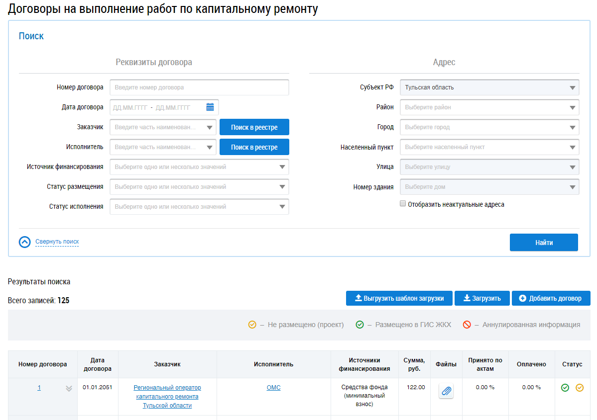 Отображается страница Договоры на выполнение работ по капитальному ремонту.