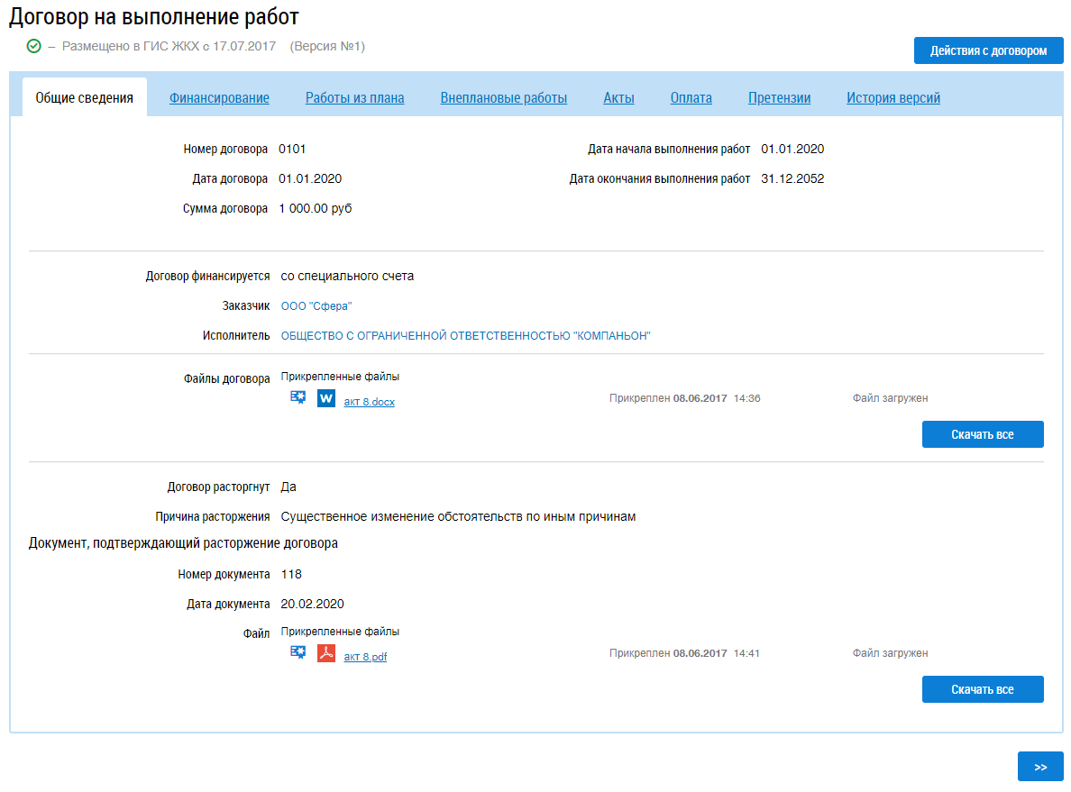 Вкладка содержит реквизиты договора, сведения заказчике и исполнителе, а также файлы договора. Для того, чтобы скачать файл договора нажмите на гиперссылку с его наименованием или на кнопку Скачать все.