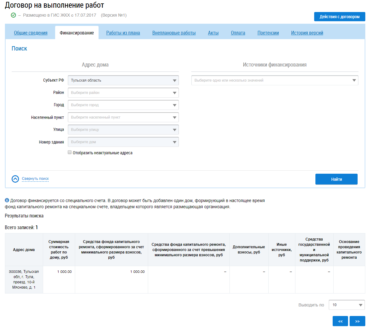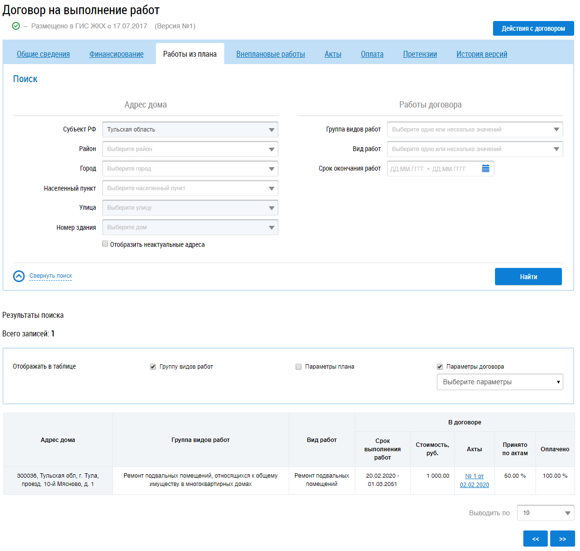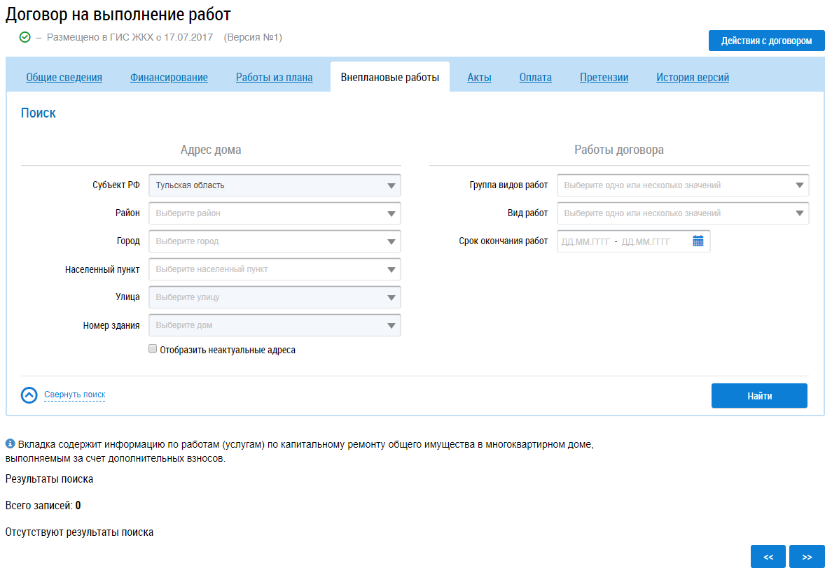 Для поиска работ заполните блоки Адрес дома и Работы договора и нажмите на кнопку Найти. В результатах поиска отображаются соответствующие введенным параметрам работы.