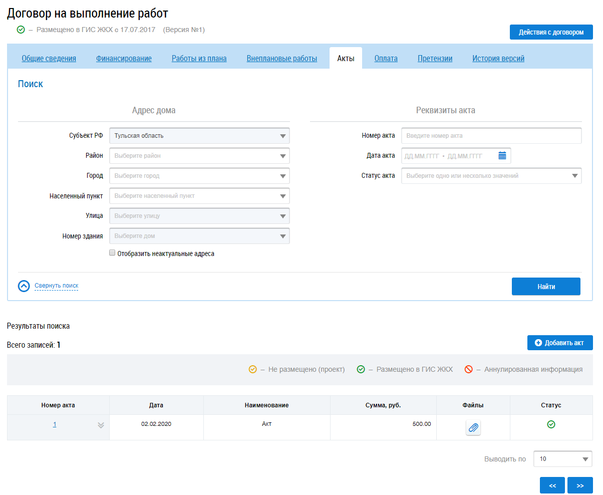 Для поиска актов заполните блоки Адрес дома и Реквизиты акта и нажмите на кнопку Найти. В результатах поиска отображаются соответствующие введенным параметрам акты.