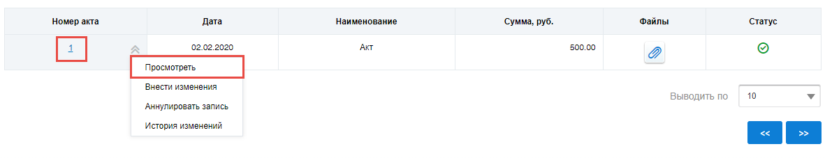 Для просмотра акта выберите пункт контекстного меню акта Просмотреть или нажмите на гиперссылку с номером акта.
