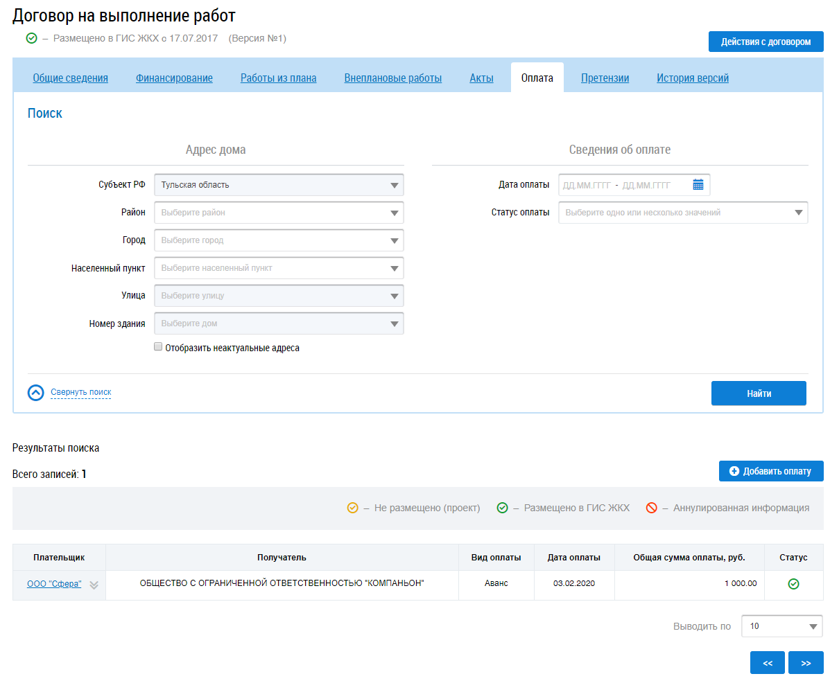 Для поиска информации об оплате заполните блоки Адрес дома и Сведения об оплате и нажмите на кнопку Найти. В результатах поиска отображаются соответствующие введенным параметрам сведения об оплате.