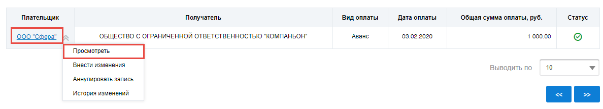 Для просмотра сведений об оплате выберите пункт контекстного меню оплаты Просмотреть.