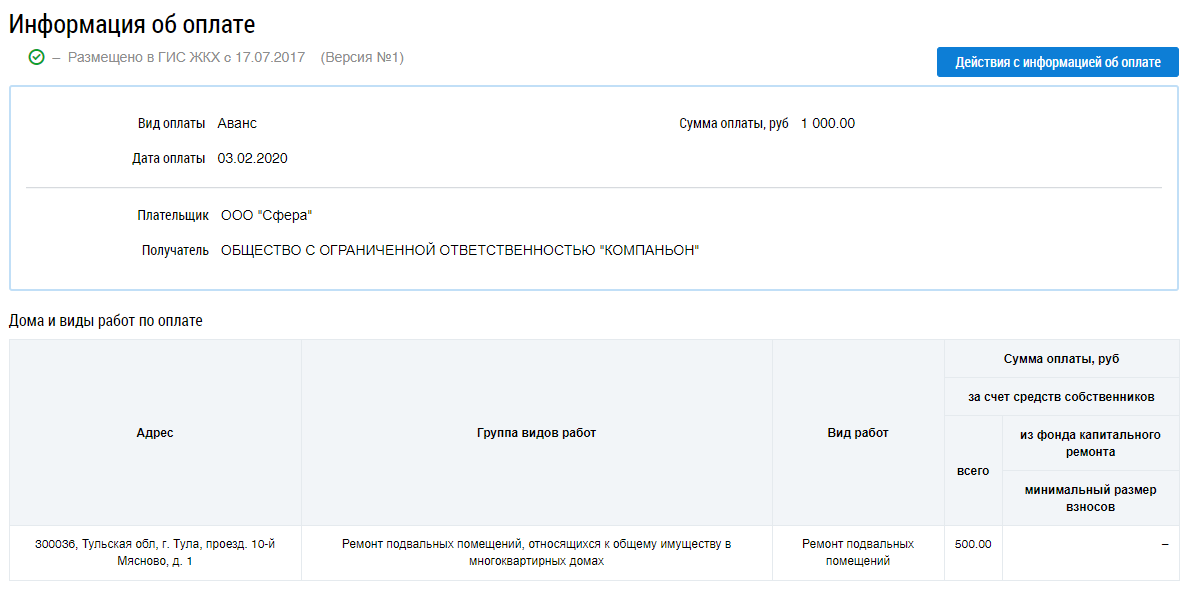 Отображается страница с информацией об оплате, а также о домах и видах работ по оплате.