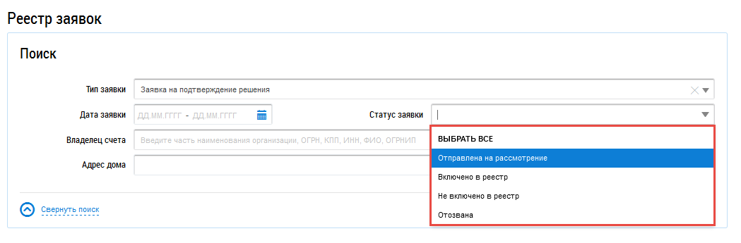 Для заполнения поля Дата заявки введите период заявки, где значение первой даты должно быть меньше второй. Для выбора статуса заявки выберите значение из выпадающего списка.