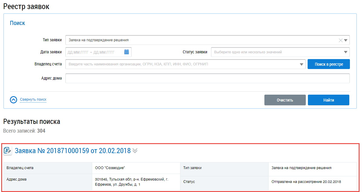 Заявки, удовлетворяющие введенным параметрам, отображаются в блоке Результаты поиска.