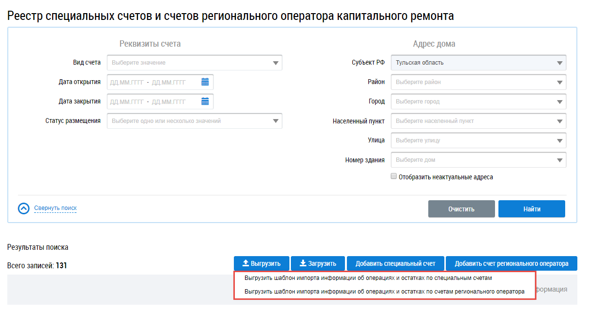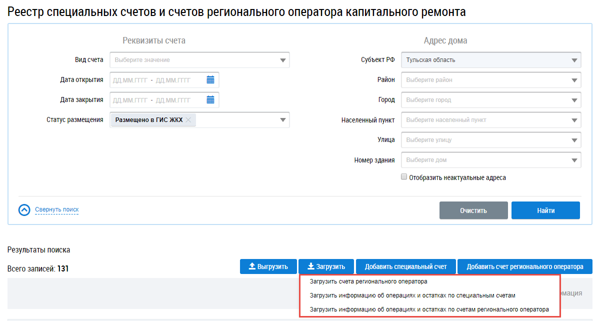 Для импорта информации об операциях и остатках по специальным счетам нажмите на кнопку Загрузить и выберите пункт Загрузить информацию об операциях и остатках по специальным счетам на странице Реестр специальных счетов и счетов регионального оператора капитального ремонта.