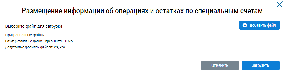 Прикрепите файл с информацией об операциях и остатках по специальным счетам, нажав на кнопку Добавить файл. Для импорта об операциях и остатках по специальным счетам нажмите на кнопку Загрузить, для отмены действий нажмите на кнопку Отменить.
