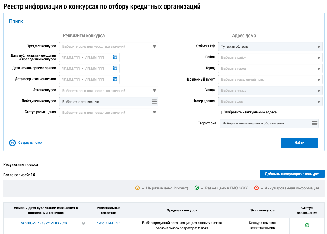 Отображается страница Реестр инфоормации о конкурсах по отбору кредитных организаций.
