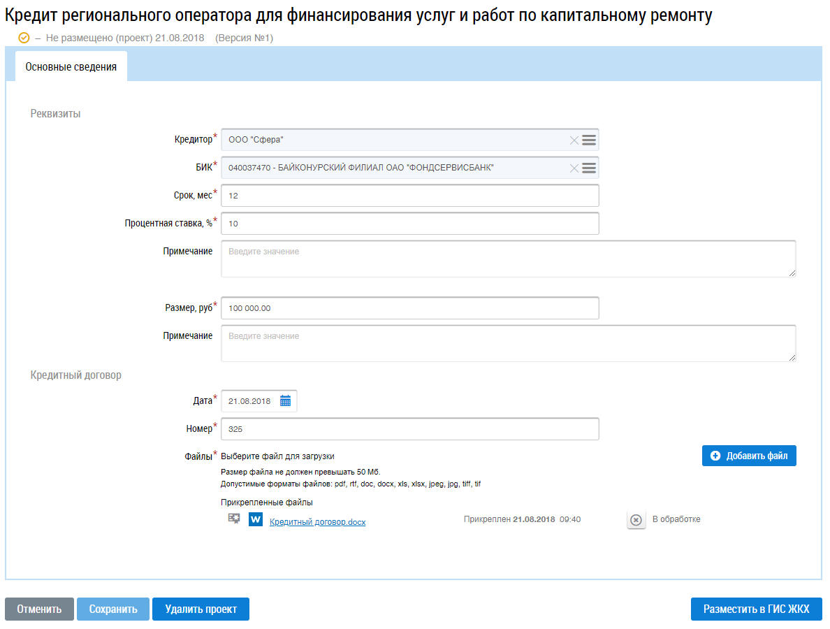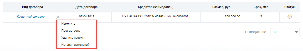 Для изменения информации о кредите выберите пункт контекстного меню Изменить для кредита в статусе Не размещено (проект).
