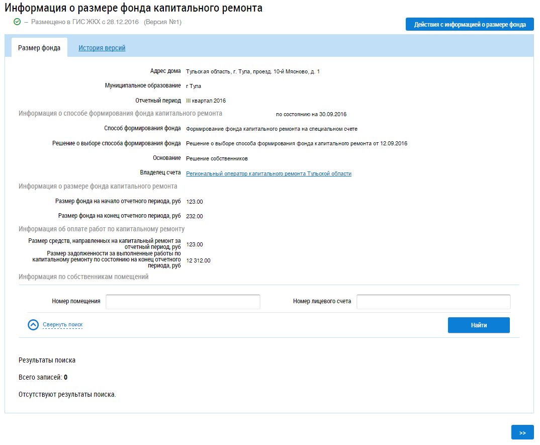 На вкладке отображаются сведения о версиях информации о размере фондов капитального ремонта.
