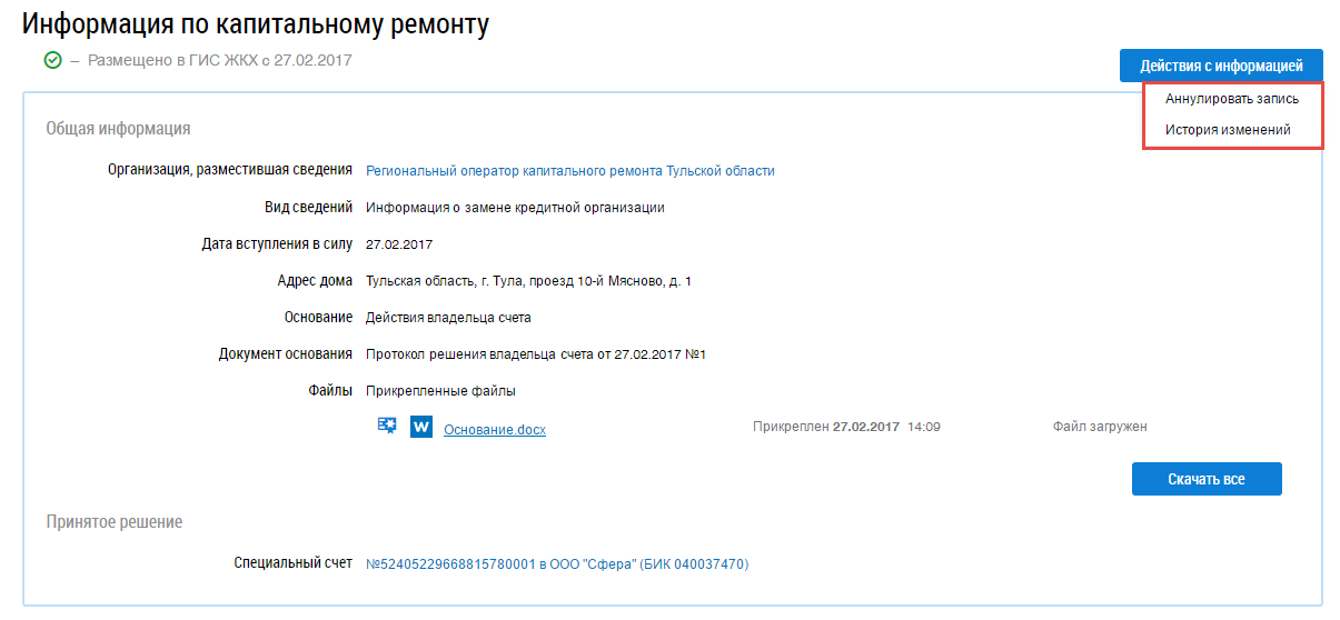 Чтобы аннулировать информацию, раскройте контекстное меню информации в статусе Размещено в ГИС ЖКХ и выберите пункт Аннулировать запись (см. Контекстное меню. Статус – «Размещено в ГИС ЖКХ») или на странице просмотра информации по капитальному ремонту нажмите на кнопку Действия с информацией и выберите в выпадающем меню пункт Аннулировать запись (Фрагмент страницы «Информация по капитальному ремонту». Кнопка «Действия с информацией»).