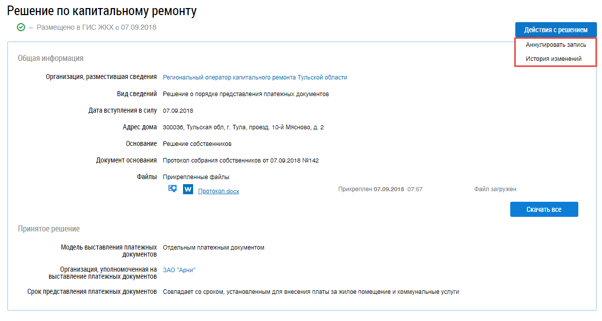 Чтобы аннулировать решение, раскройте контекстное меню решения в статусе Размещено в ГИС ЖКХ и выберите пункт Аннулировать запись (см. Контекстное меню. Статус – «Размещено в ГИС ЖКХ») или на странице просмотра решения по капитальному ремонту нажмите на кнопку Действия с решением и выберите в выпадающем меню пункт Аннулировать запись (Фрагмент страницы «Решение по капитальному ремонту». Кнопка «Действия с решением»).