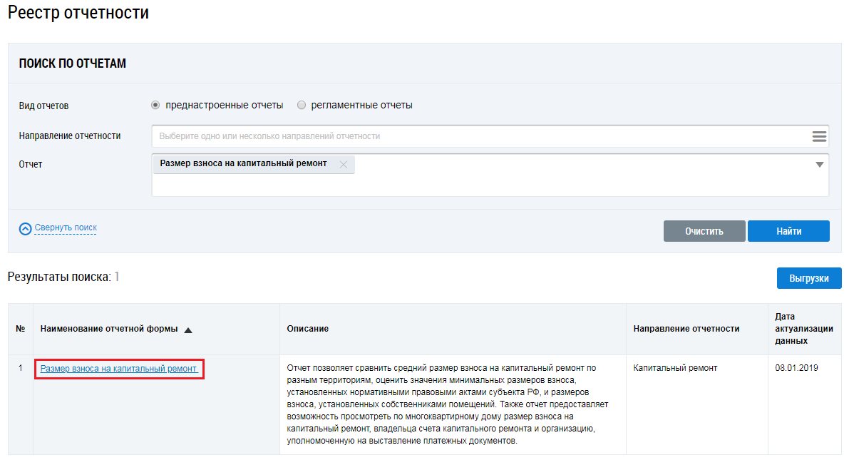 Для перехода на страницу Информация о размере взносов на капитальный ремонт установите переключатель Преднастроенные отчеты. Затем нажмите на гиперссылку с наименованием отчета Размер взноса на капитальный ремонт.