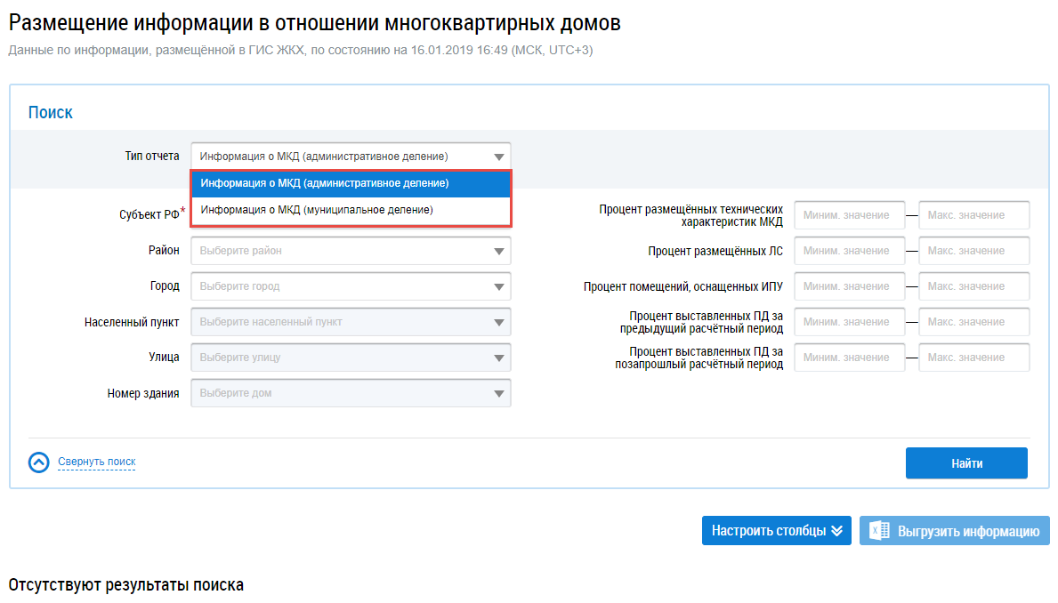 При выборе разных типов отчета отображаются различные поля поиска. Поиск отчетов по МКД возможен по одному или нескольким параметрам.