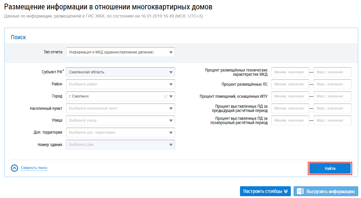 Кнопка Список МКД в столбце Просмотреть информацию о МКД отображается только если в муниципальном образовании размещена информация о домах, у которых код ОКТМО совпадает с кодом ОКТМО муниципального образования.