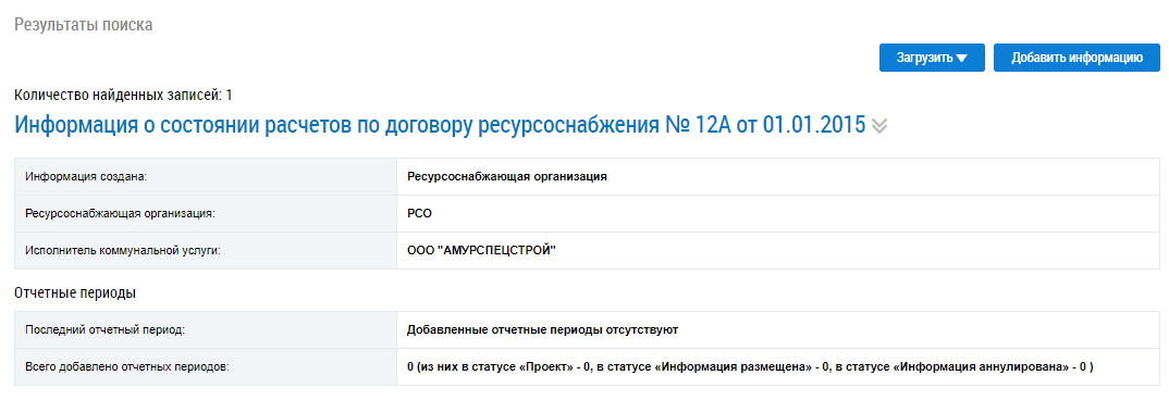 После задания критериев поиска на странице Информация о состоянии расчетов нажмите кнопку Найти. В блоке результатов поиска отобразится информация, соответствующая критериям поиска. Для просмотра аннулированной информации в блоке поиска установите флажок в поле Отобразить аннулированную информацию.