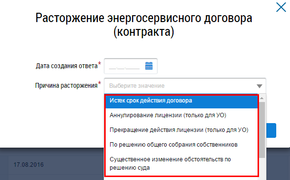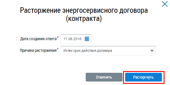 В отобразившемся окне Расторжение энергосервисного договора (контракта) заполните обязательные поля. Причину расторжения выберите из выпадающего списка.