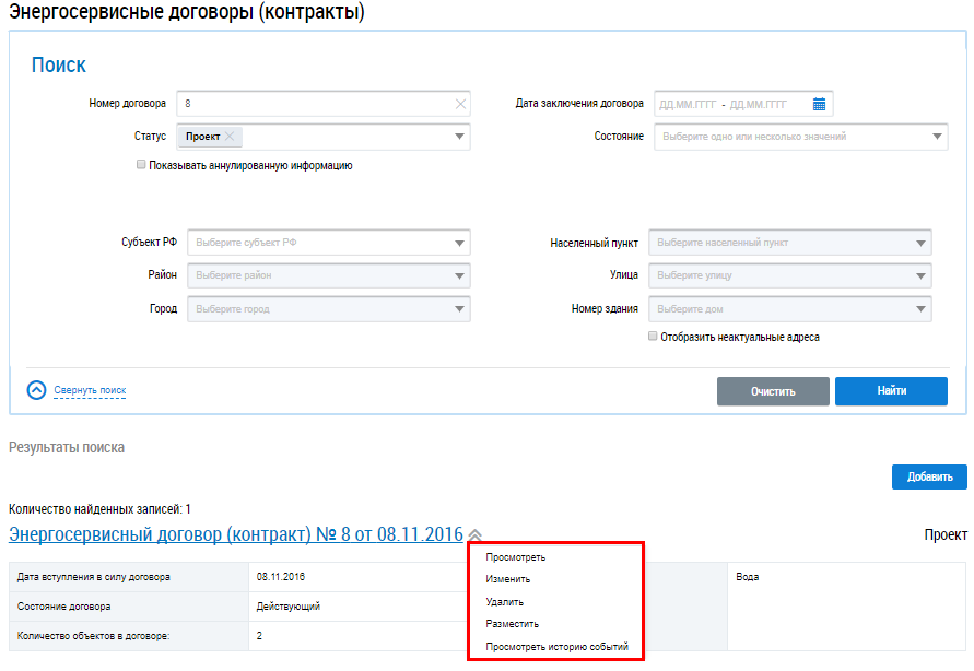Для удаления информации об энергосервисном договоре (контракте) нажмите на кнопку Действия, в выпадающем списке выберите пункт Удалить.