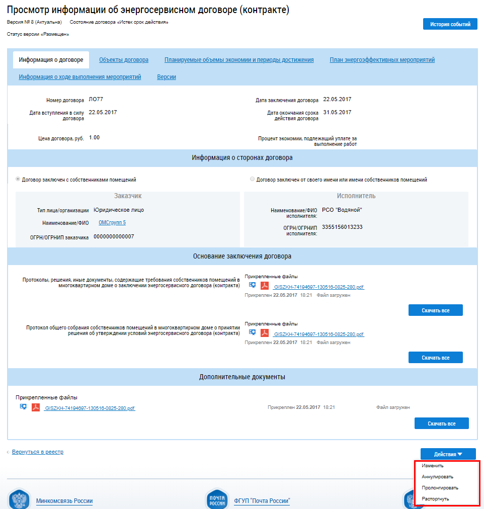 Для изменения информации об энергосервисном договоре (контракте) нажмите на кнопку Действия, в выпадающем списке выберите пункт Изменить.