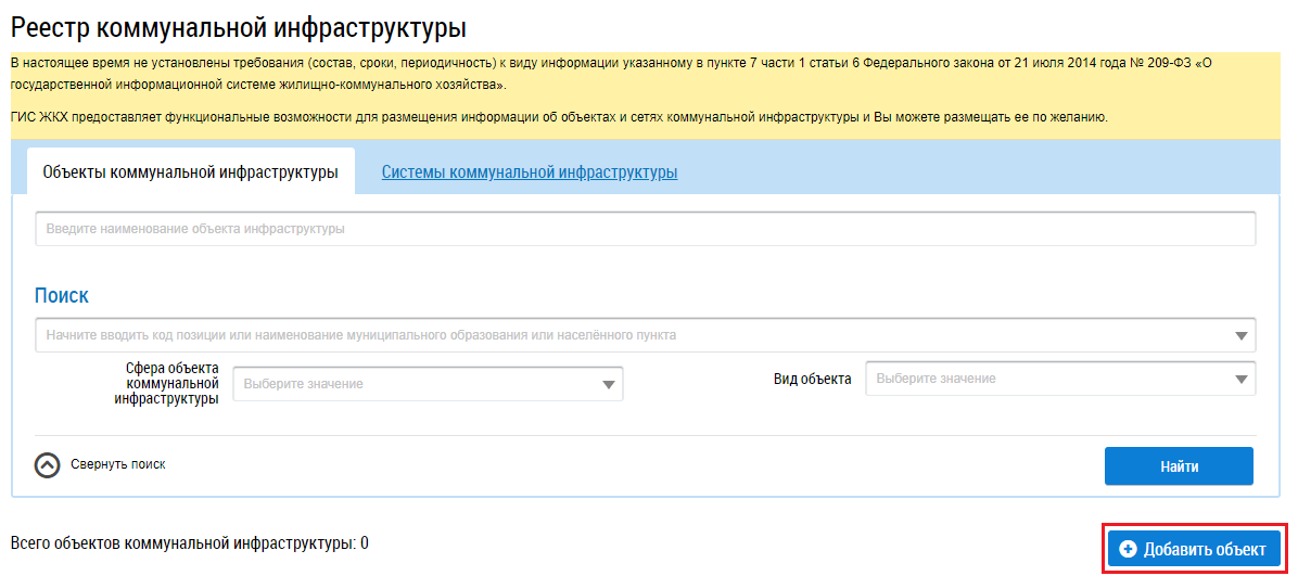 Для добавления объекта в реестр необходимо на вкладке Объекты коммунальной инфраструктуры нажать на кнопку Добавить объект.