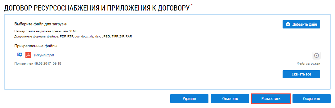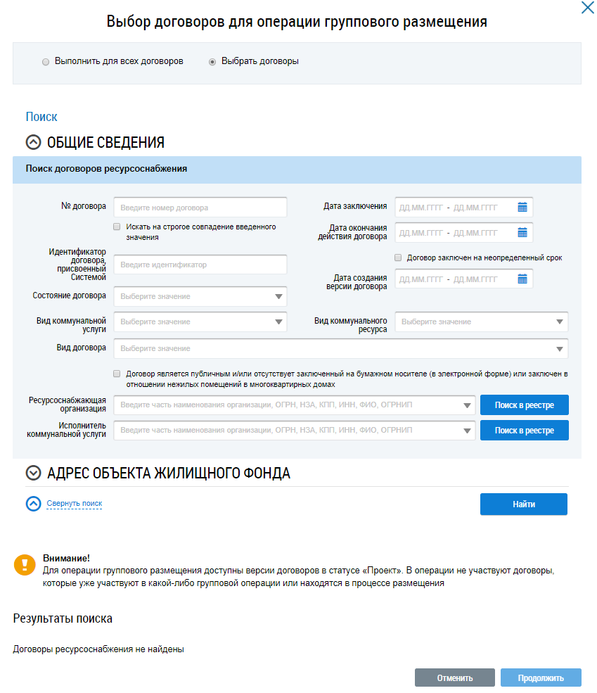 Операция размещения доступна для договоров в статусе Проект при наличии хотя бы одного добавленного объекта жилищного фонда, куда поставляется коммунальный ресурс.