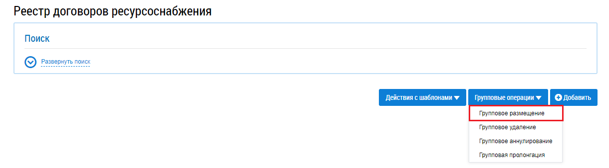 Система также предоставляет возможность произвести групповое размещение договоров. Для этого нажмите на кнопку Групповые операции на странице Реестр договоров ресурсоснабжения и выберите пункт контекстного меню Групповое размещение.