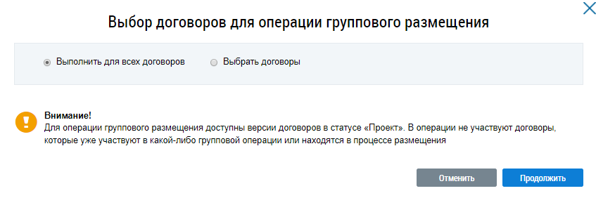 Вы можете выполнить групповое размещение, как для всех договоров в статусе Проект, так и выбрать договоры вручную.