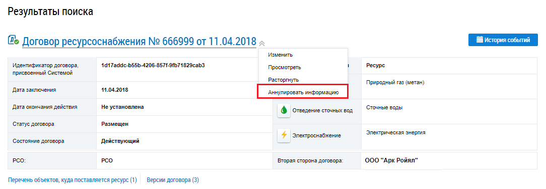 Чтобы аннулировать информацию по договору ресурсоснабжения раскройте контекстное меню и выберите пункт Аннулировать информацию.